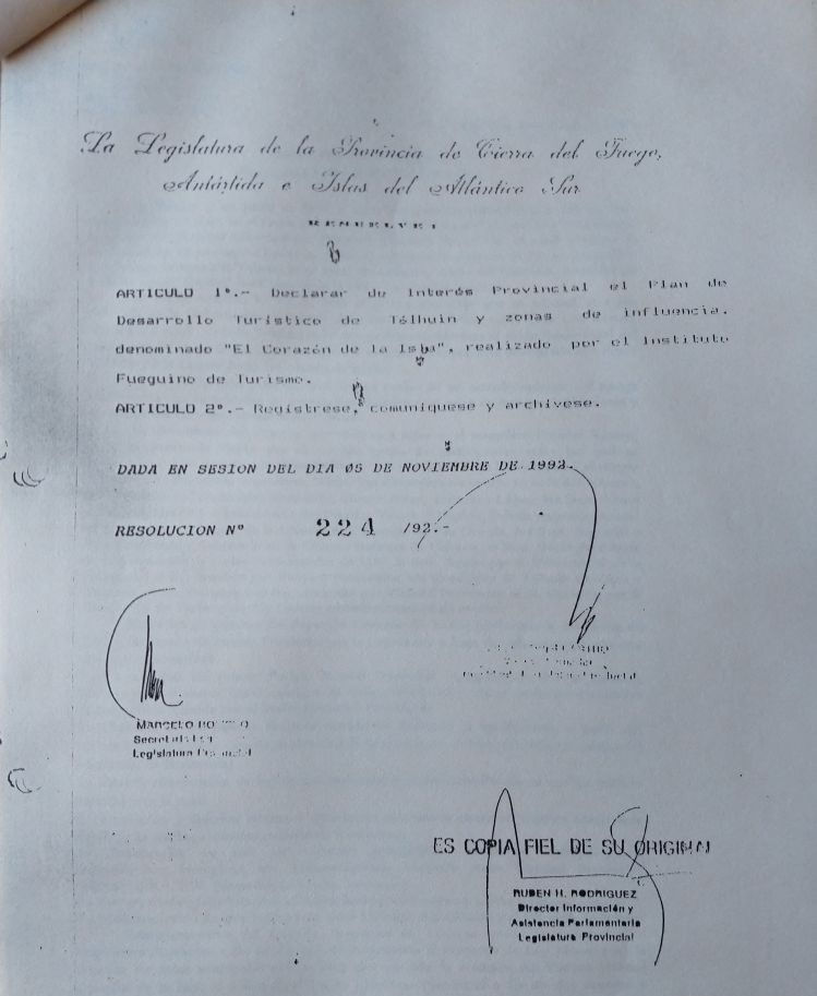 6.- 05/11/92 El Proyecto Corazón de la Isla es Declarado De Interés Provincial por la Legislatura mediante Resolución 224/92